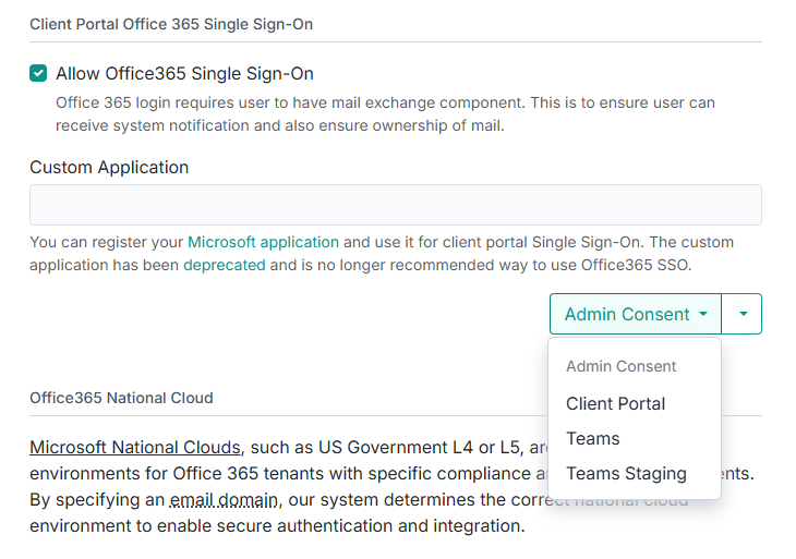 System>Authentication>TECH Portal Office365 Single Sign-On(For TECH Portal users only.) - Select the drop-down for "Admin Consent" and select "DeskDirector" (for Tech Portal users)For Tokity users, this will be labelled Portal and not DeskDirector.