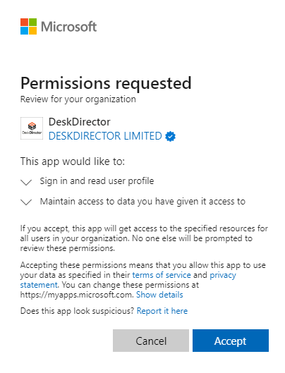 You can perform admin consent to grant DeskDirector read user profile access for a specific tenant. You can perform that under the company profile page or the authentication page. Admin consent will not grant DeskDirector access to list users in the tenant. It only allows auto-approve consent when a specific user of that tenant requests it.