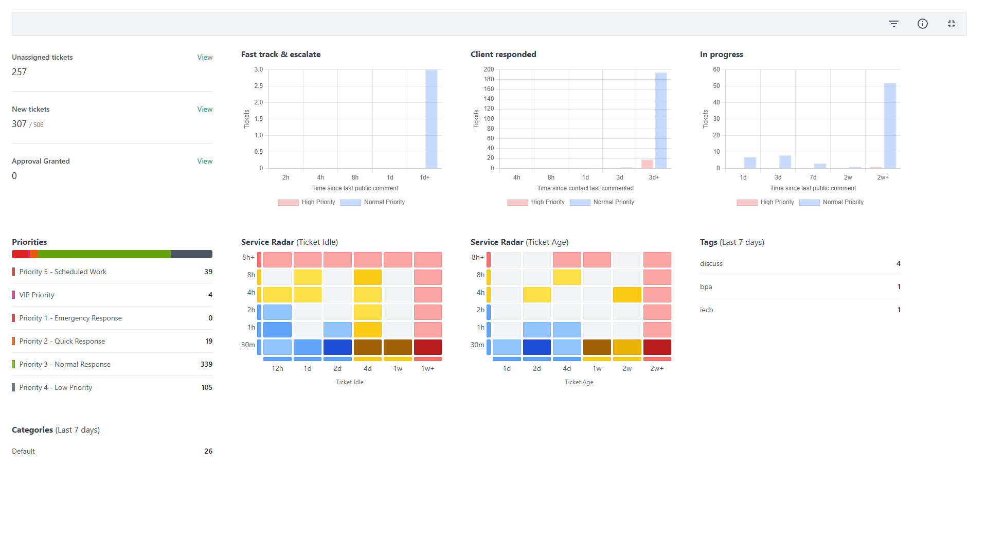 The Service Radar provides a clean, intuitive, and fast way of seeing your ticket statistics at a glance. It can be useful in seeing where your service is doing well and also where you may want to look for improvements to provide to your end users.