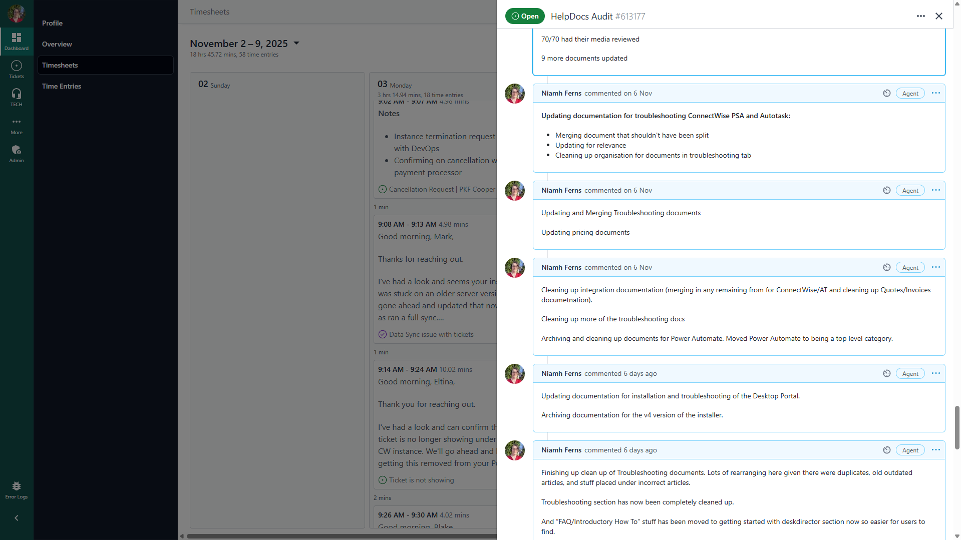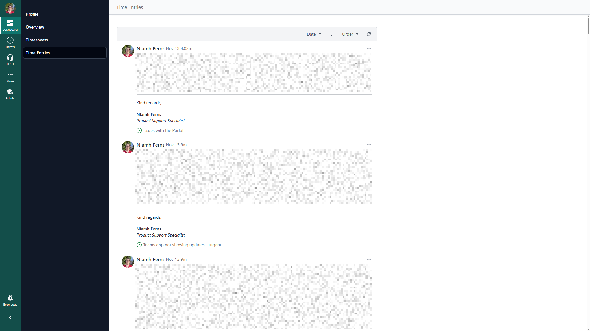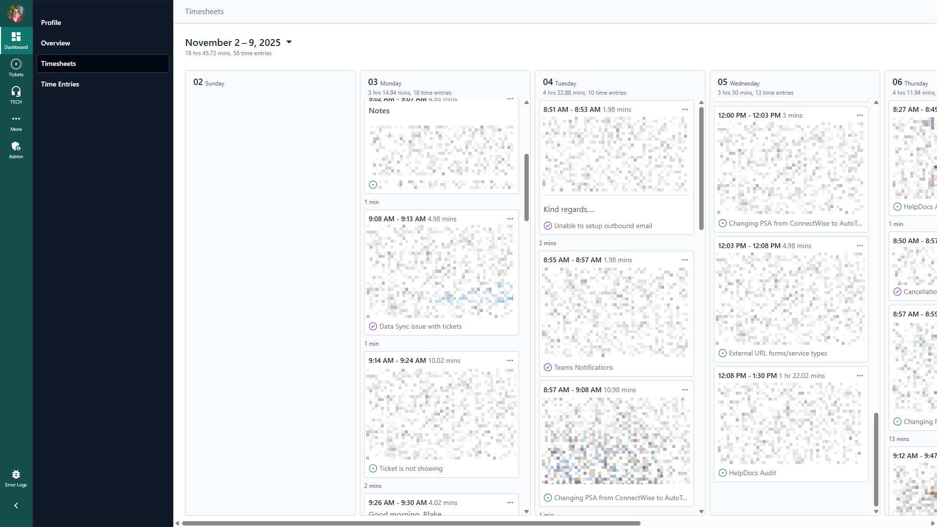 Under the Timesheets tab, you'll see a view of your existing time entries, what day they were made, and the related note added for these entries: