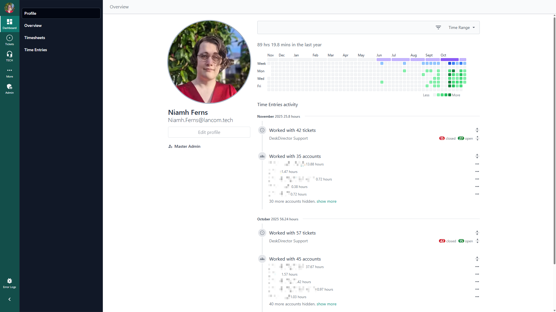 Under the profile tab, you can see a brief overview or your time entries, the accounts you've worked on, and some at-a-glace stats for the person currently logged in: