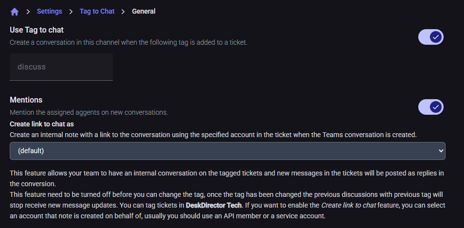 3. Type chatingeneral or whatever other tag you want to use. After this tag is set, whenever a service agent tags a ticket in DeskDirector with chatingeneral a discussion thread will be started.