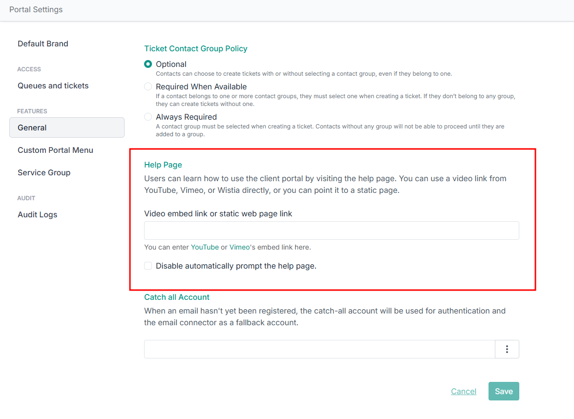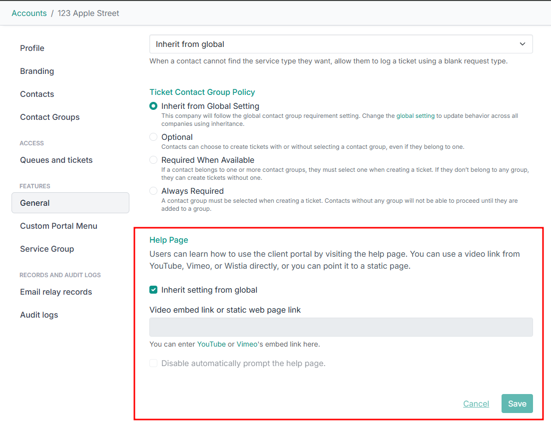 You can also define specific help pages for companies you handle. All you need to do is go to Client Portal > Accounts, select the company you want to set the help page for then head to the Features > General tab. Scroll down to the Help Page section and enter the specific URL you want to set as the help page for this company.