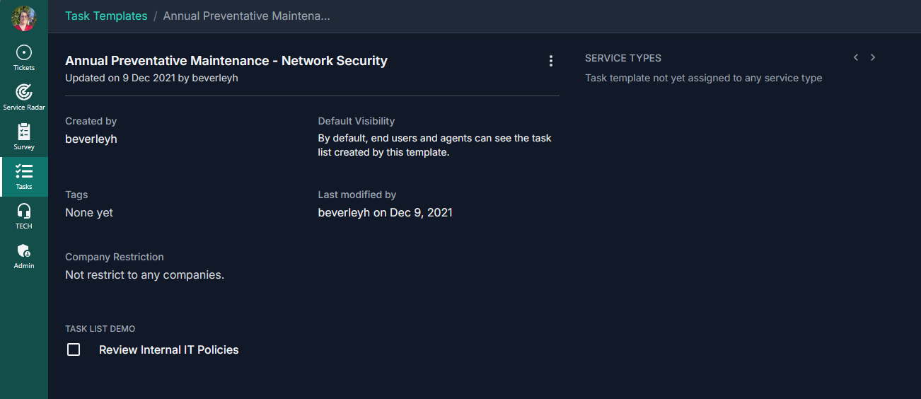 Task list templates are reusable templates that can be attached to Service Types, or manually attached to a ticket by an agent. The template editor can be accessed in the Admin and Tech portals by members with the following permissions: advanced member, admin, master admin. You can find a list of your Task Templates on the left hand navigation panel.