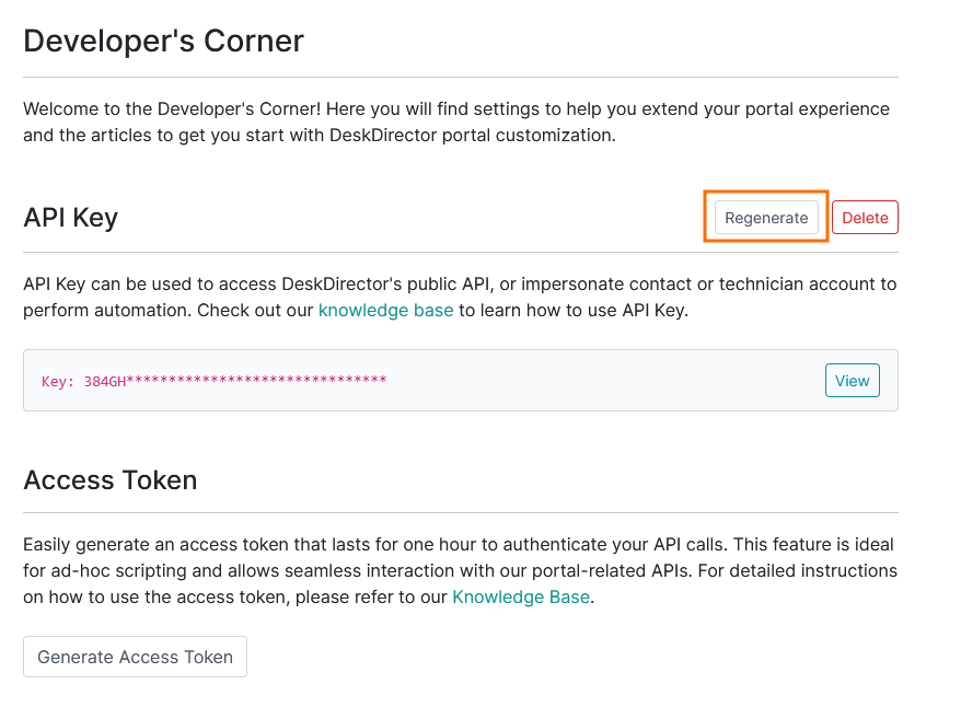 Admin Portal>Advanced>API Keys(orAdmin Portal>Advanced>Developer Cornerif using a PSA backend): This is needed if you are trying to access the API programmatically, as you'll need to generate an access token. If you only need a one-off check, you can skip this. - An Access Token: This is used to authenticate to most DeskDirector API endpoints.