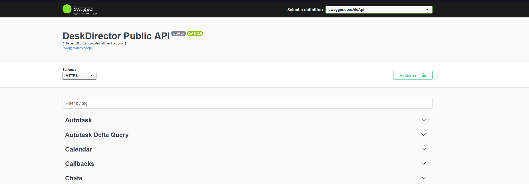 Every DeskDirector instance has a Swagger interface that allows you to explore our API. To see this, navigate to https://[your-subdomain-here].deskdirector.com/swagger. At the top of the Swagger interface, you can select which API version you would like to reference.