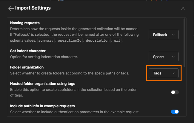 - Under View Import Settings, select whether you want it to display your API based on tag (folder nesting will appear as it does in Swagger) or based on path (folder nesting will be based on the API endpoint's path):