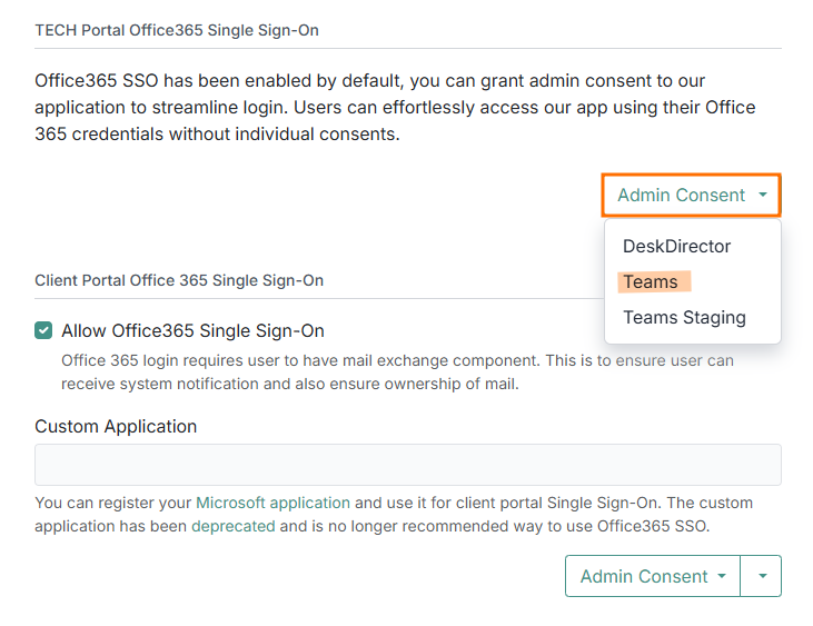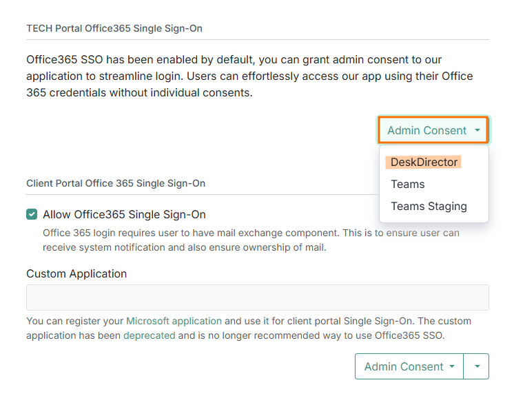 - Under the "Tech Portal" section, regrant admin consent for DeskDirector: