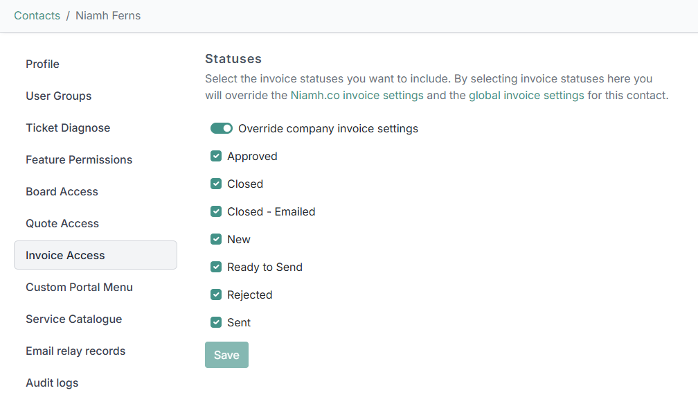 On this page, you can select which invoice statuses you want to appear globally for all contacts under your DeskDirector instance. Any settings in this are overridden by settings for specific companies (under Portal > Companies > "Company Name" > Invoice Access) or contacts (under Portal > Contacts > "Contact Name" > Invoice Access).