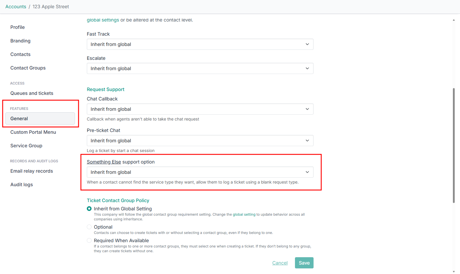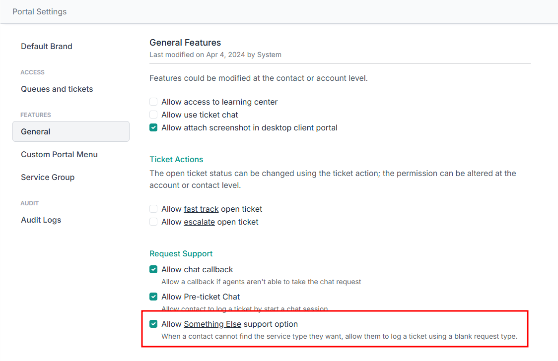You can locate this setting in the Admin Console under Client Portal > Global Settings > Features > General. Here you can disable the feature globally by tick selecting the "Disable Something Else support option".