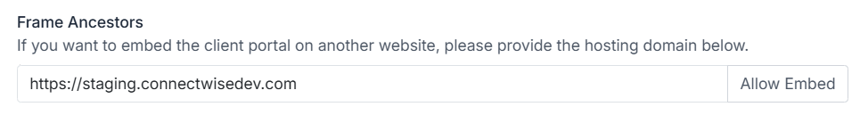 System > Security > Content Security Policy > TECH Portal, I've allowed my ConnectWise URL under the Frame Ancestor section