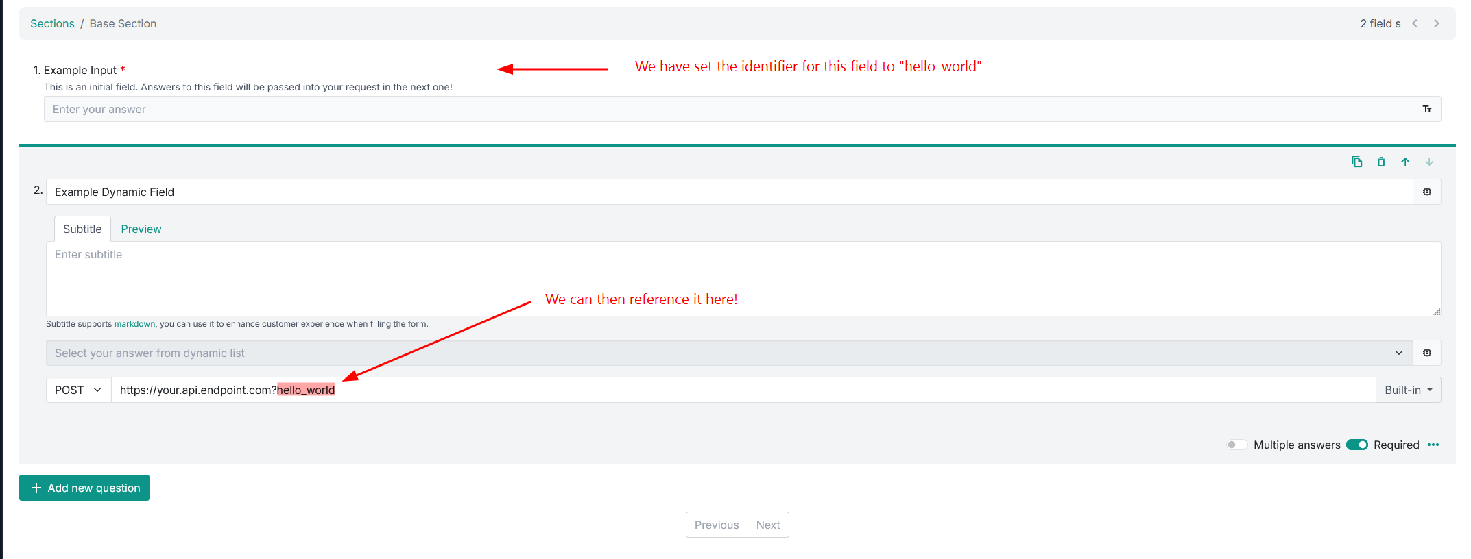 Depends on your API URL, whether it already contains query parameter or not. I will give two examples below. The field ID we will use field_id_one and field_id_two as an example. Purple part is your API URL, where pink suffix is the additional query parameter we have added.