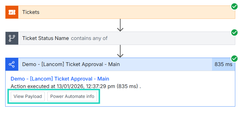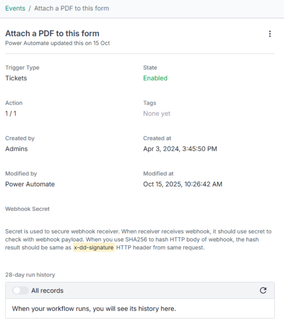 - If this triggers as expected, you will see results under the 28-day run history. Selecting a result will provide useful troubleshooting information, like the Payload and additional Power Automate information: