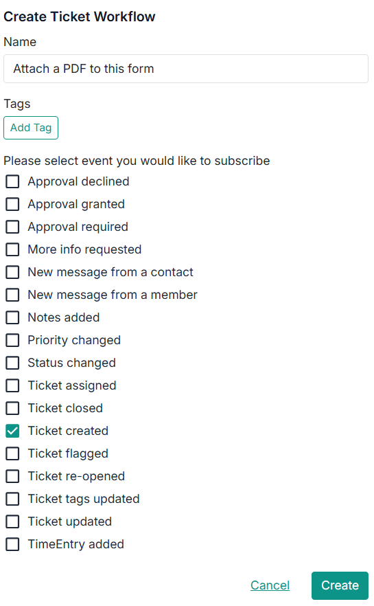 - Name your Workflow, as well as the Events you would like to subscribe to: