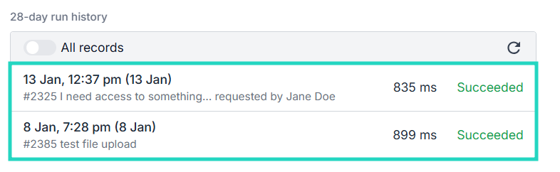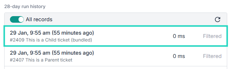 - All records: Toggle to show filtered runs (trigger event occurred but did not pass filters)