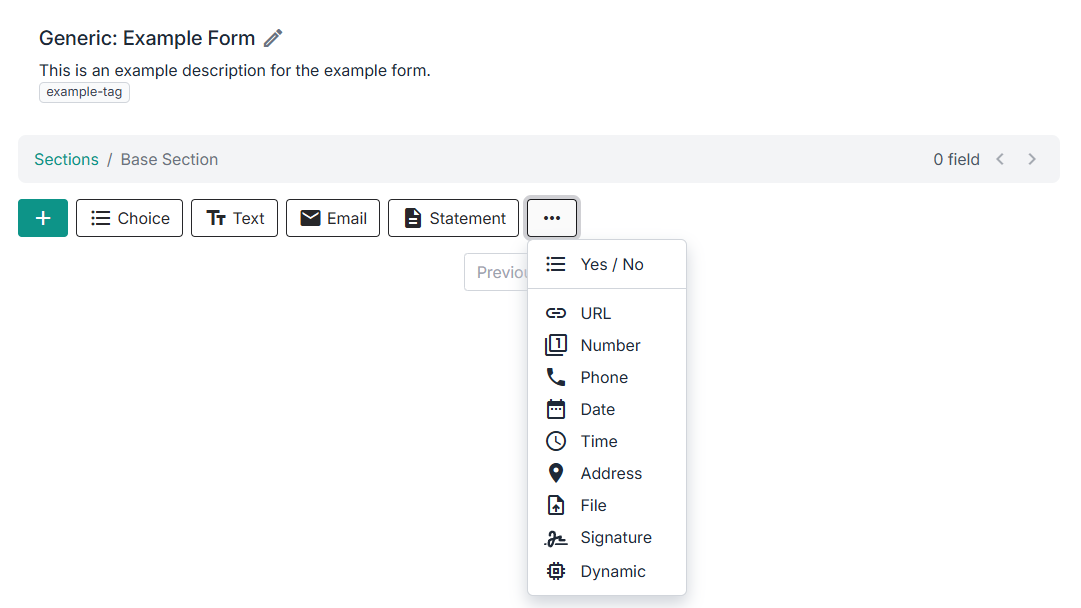 When you create a Form, it will appear in what is called the Base Section by default. That translates to the form having one page in the Client Portal. Forms let you add new sections to your form, so you can break the form down into multiple pages making it easier to fill and more digestible for users.