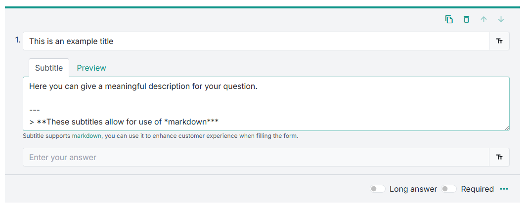 The second field is the “Question Description” which will be displayed in a smaller font (by default) under the question. To give you a bit of flexibility on the format of the text, this field can also take in Markdown. This field is useful if you wish to expand on the exact meaning of the question. This field is optional.