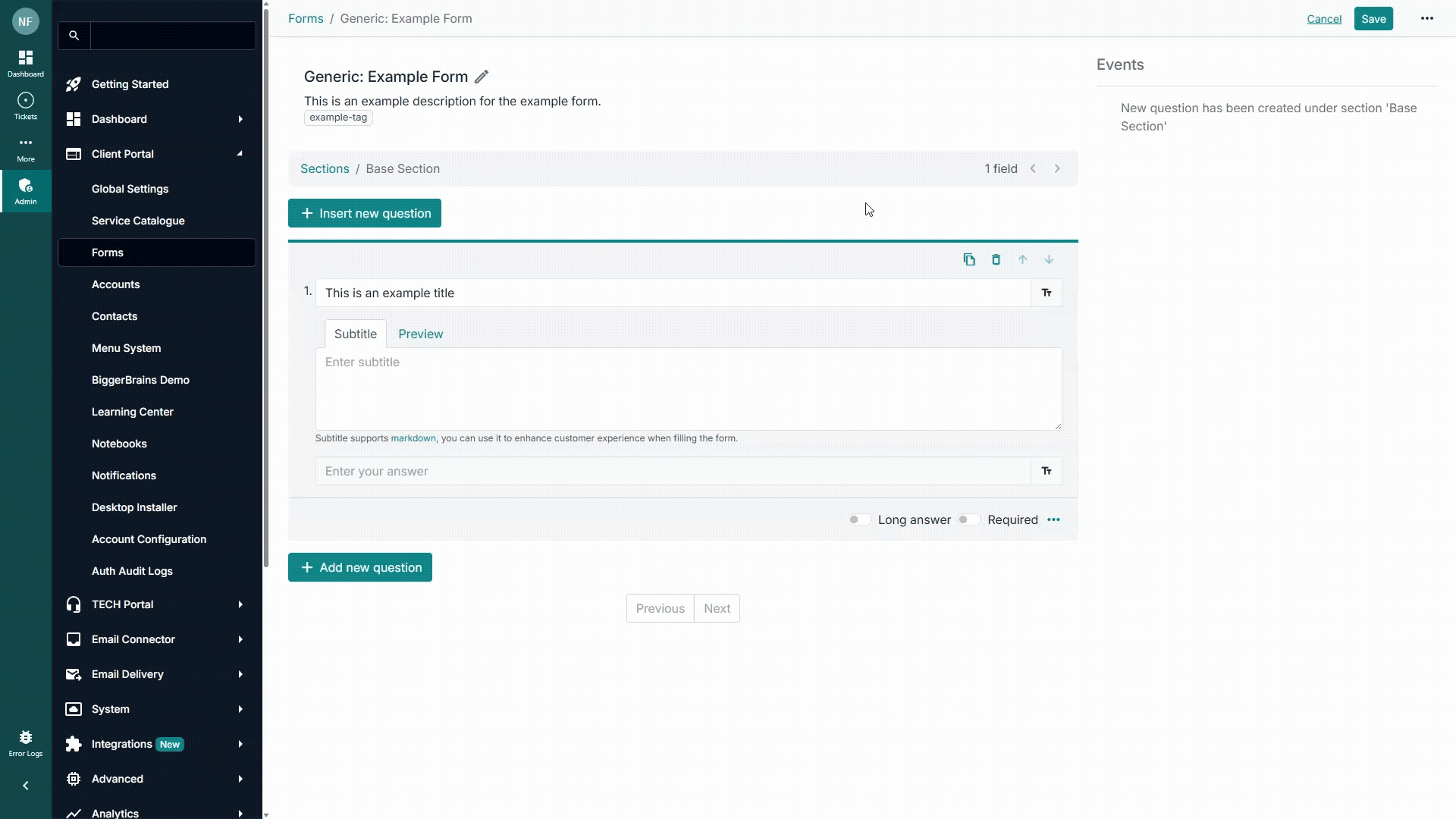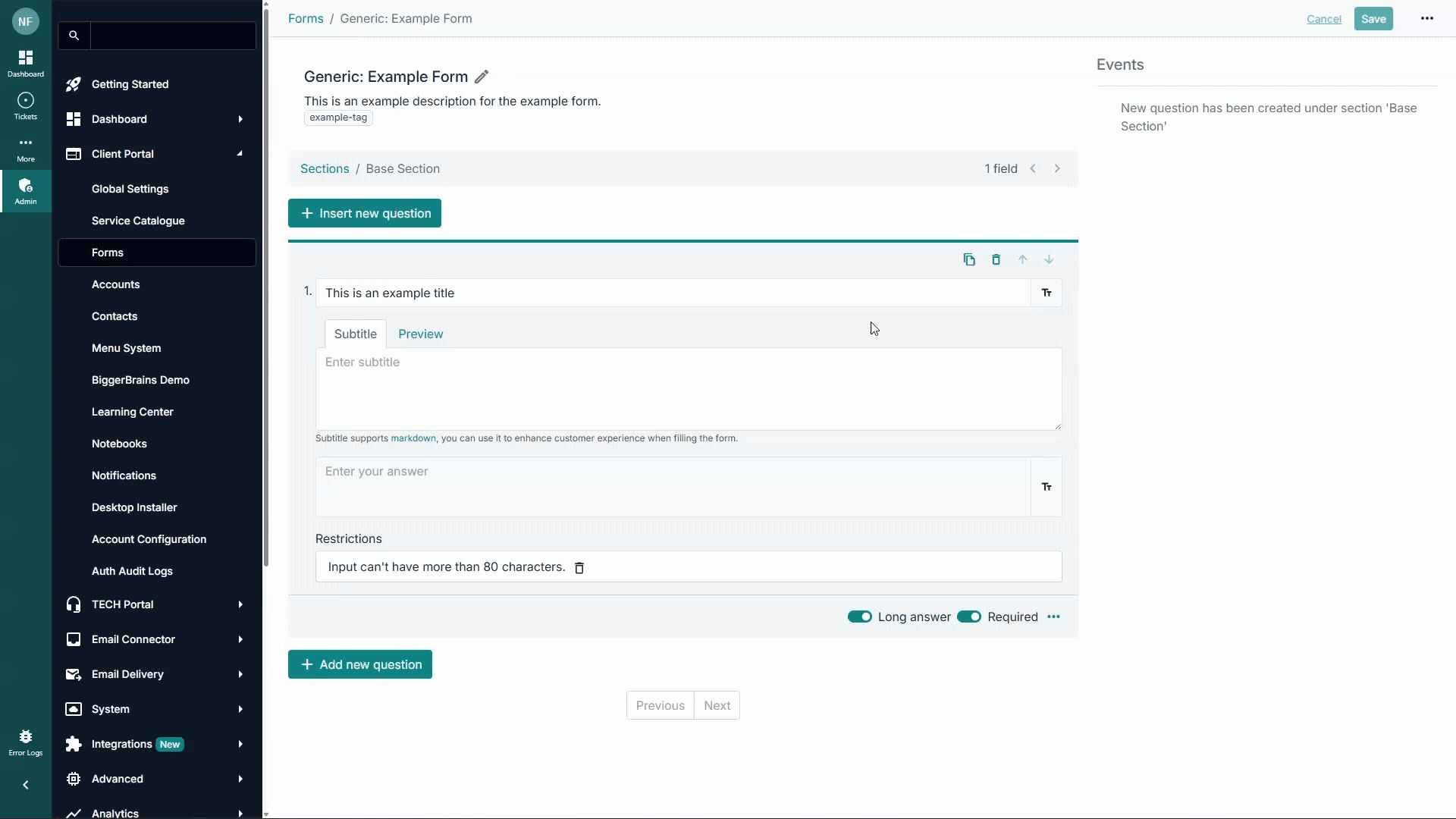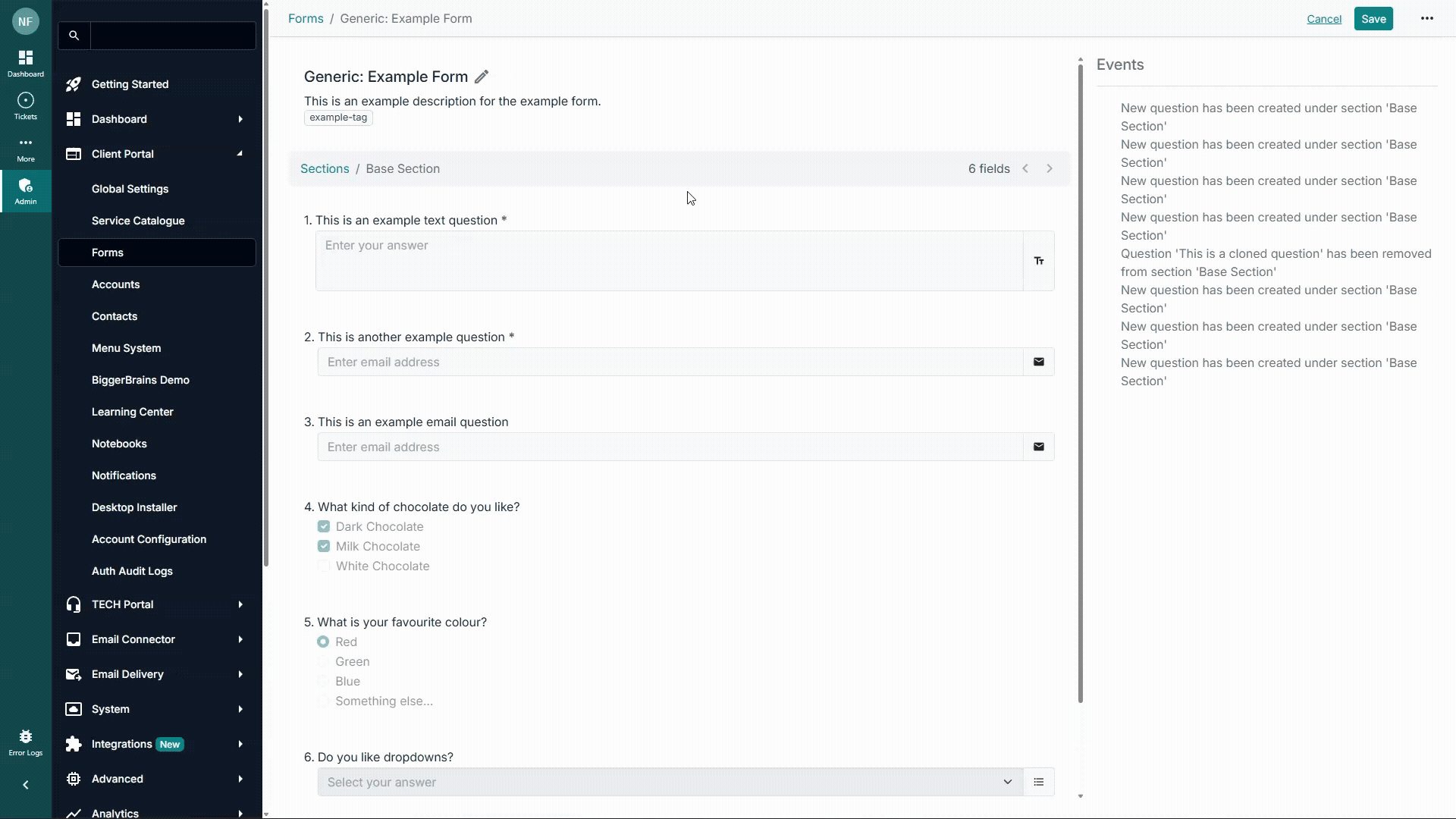 All of your DeskDirector forms will be created inside our Portal, using our own form builder. Just open the Admin Portal and head to Client Portal > Forms.