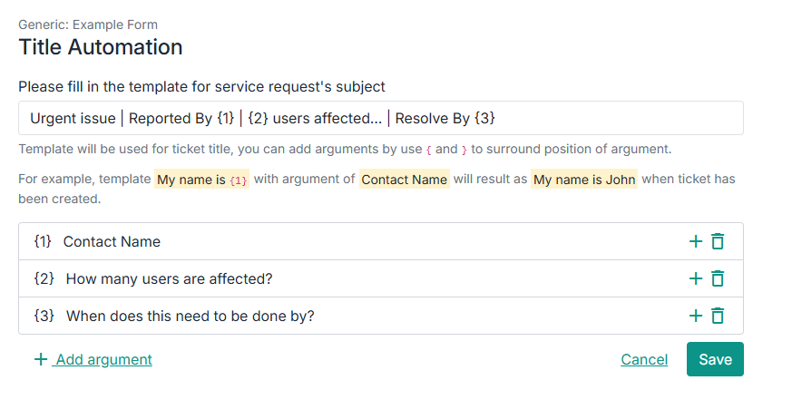 Ticket title automation is a powerful feature, and overcrowding it with information defeats the purpose of having a first-glance idea of what the ticket contains. We recommend to choose a maximum 3-4 arguments to form your ticket.
