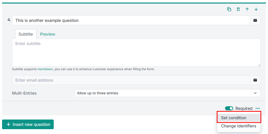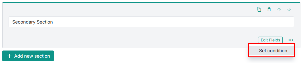 The 'set condition' option helps define whether the section should only appear if the end user chooses a specific answer to one of the previous section's questions. More information is discussed below.