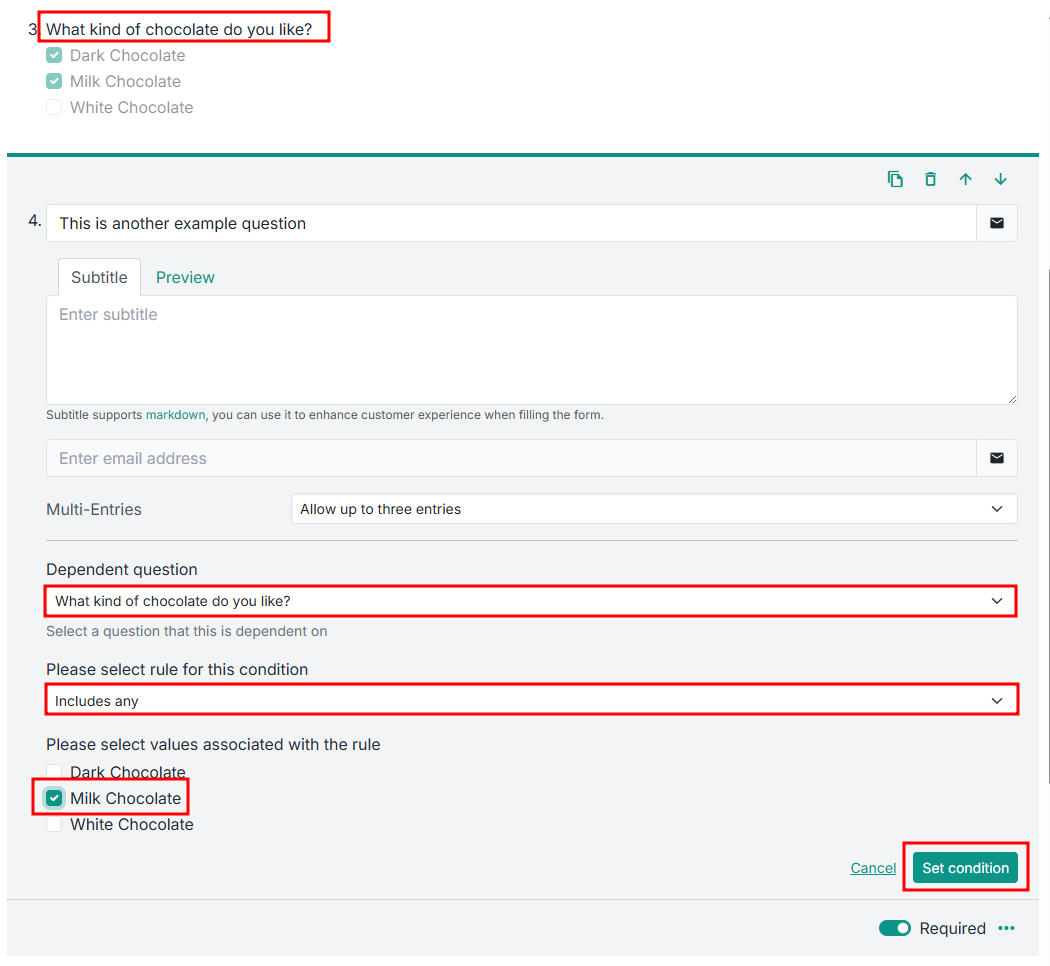 - You will then need to define the rule you want this conditional question to follow. (In the example above, the question will only show if you select "Milk Chocolate".)