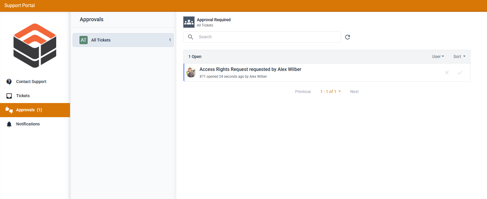 Like the name suggests, the approval list will show every ticket that is pending approval. It will show who submitted the ticket, when it was created, the ticket title and the ticket number.