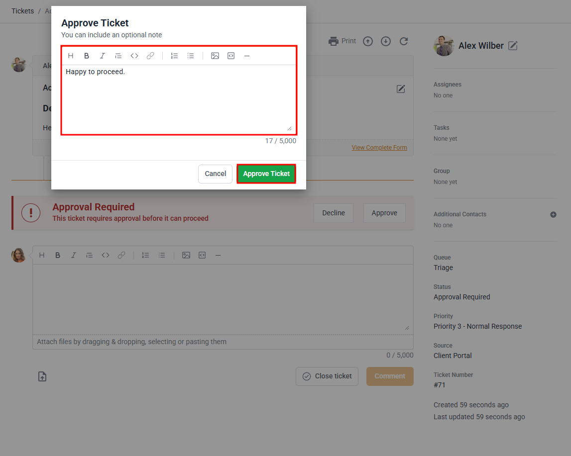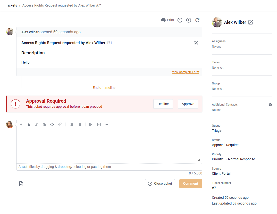 Approvalssection in their DeskDirector Portal showing any tickets that need their approval.) - From here they can open the ticket and approve or decline it.