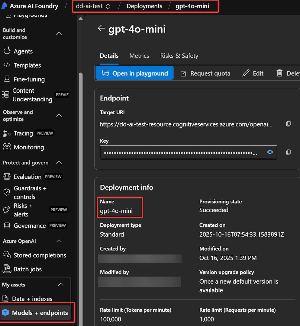- Obtain your API key, endpoint, and deployment details from the deployed model (model name, model ID, deployment nameIn this screenshot, the deployment name and name are both