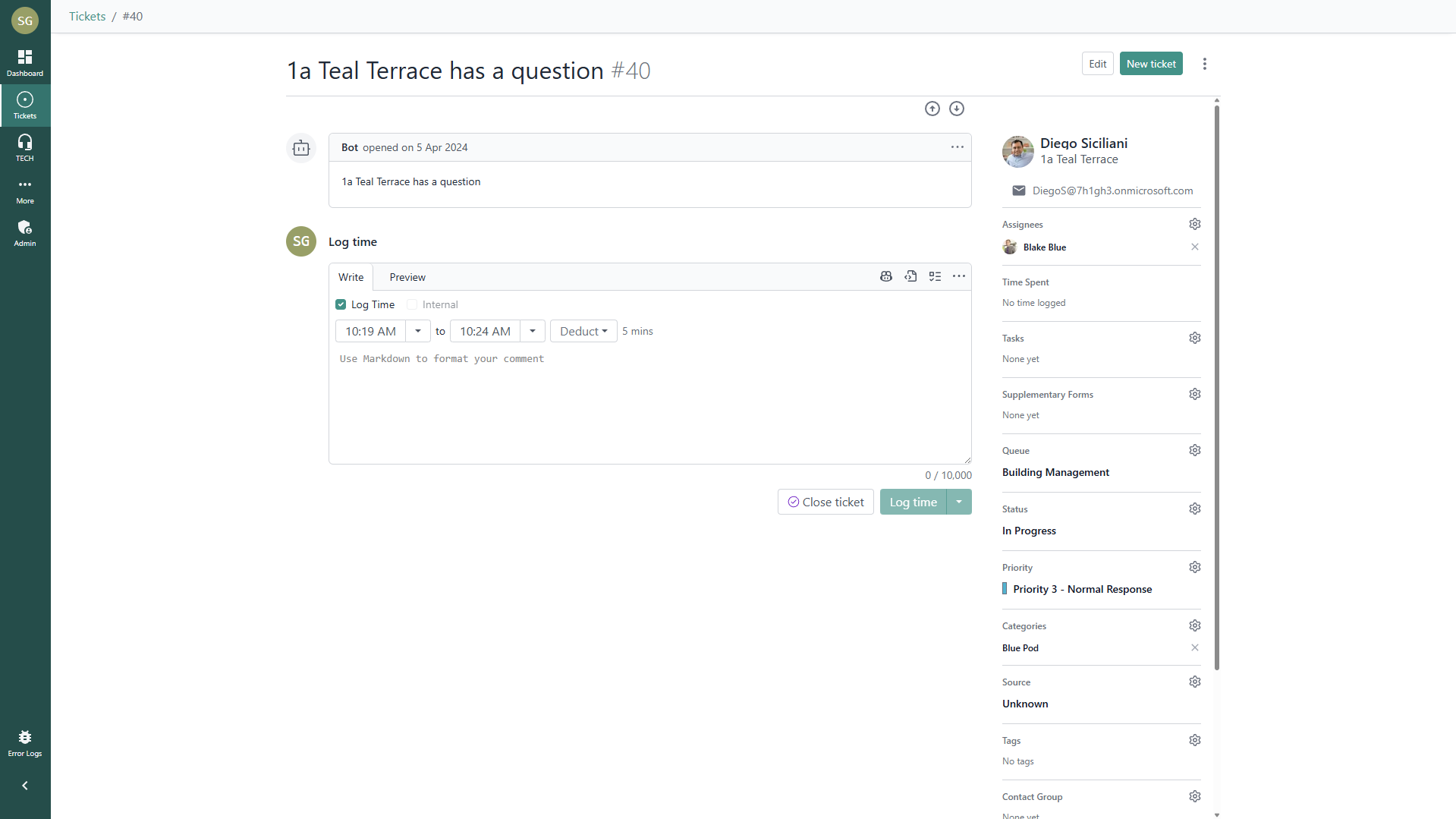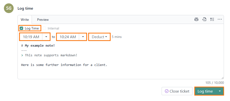 To add time to a ticket, make sure your ticket is not marked as an internal note, then add your details. You then select the Log Time checkbox and add your start time, end time, and any time that should be deducted.
