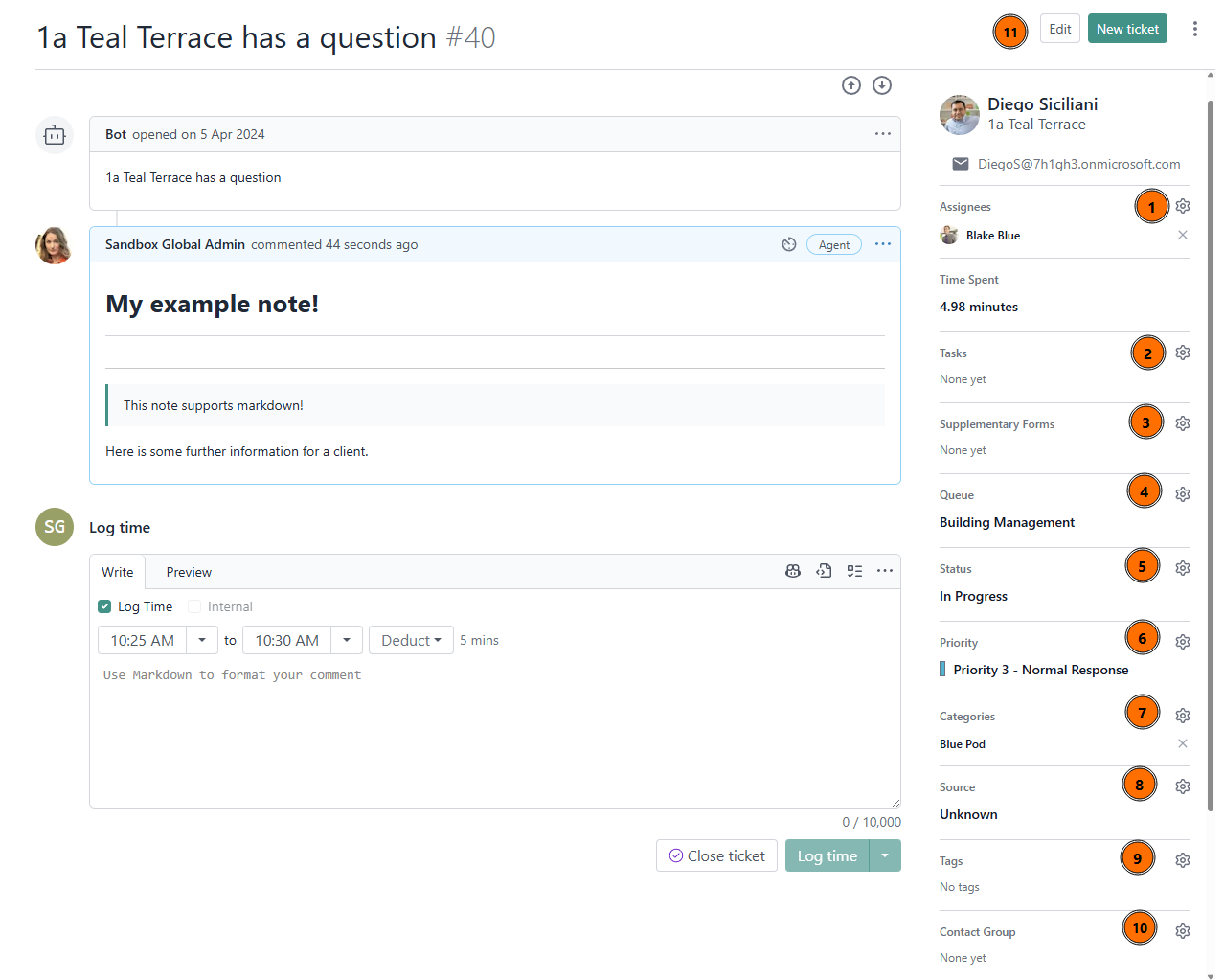 To start working on a ticket, select the ticket you're interested in and you will be presented with the new ticket interface: