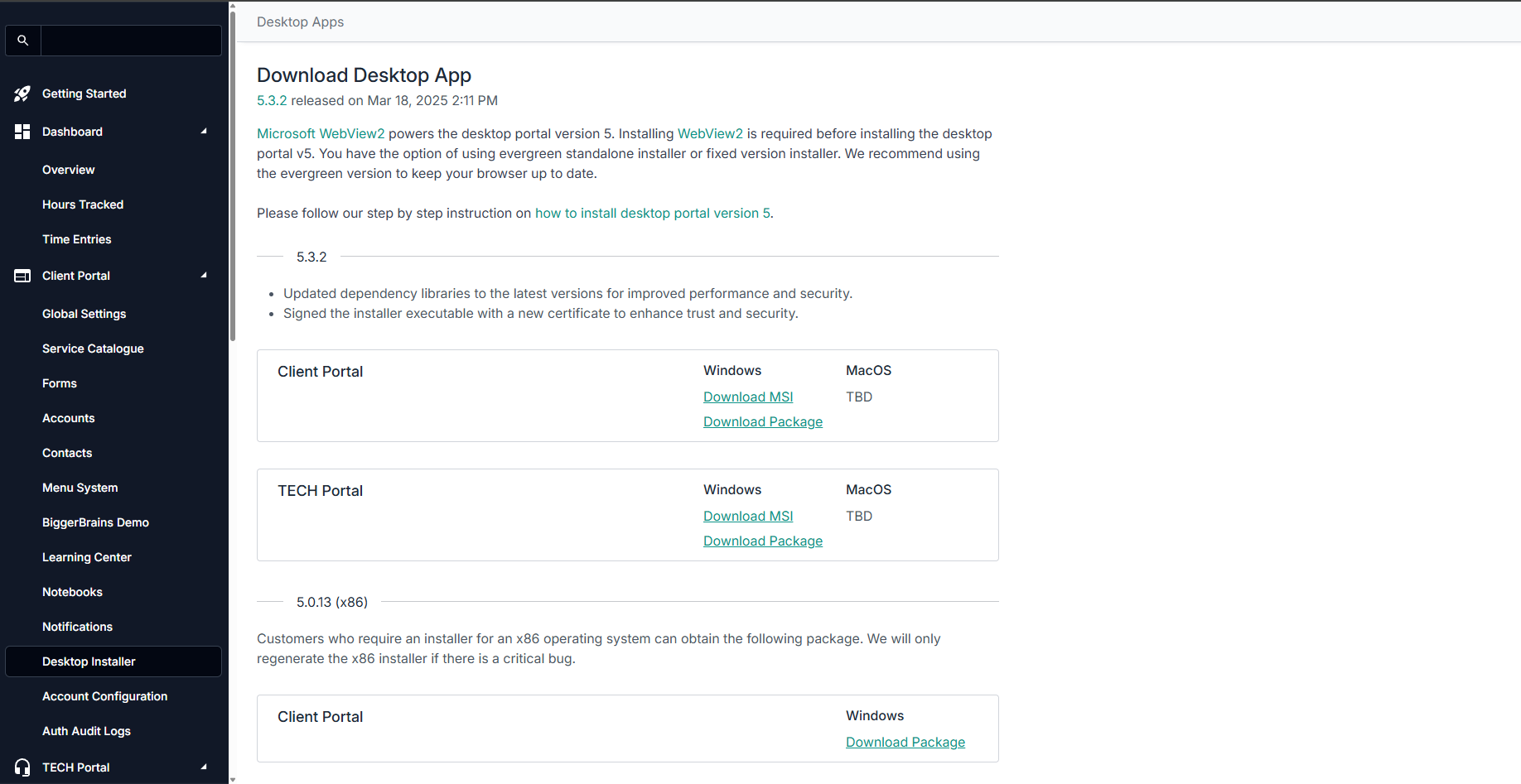 To install the DeskDirector desktop portal, open the Admin Portal and head to Client Portal > Desktop Installer:
