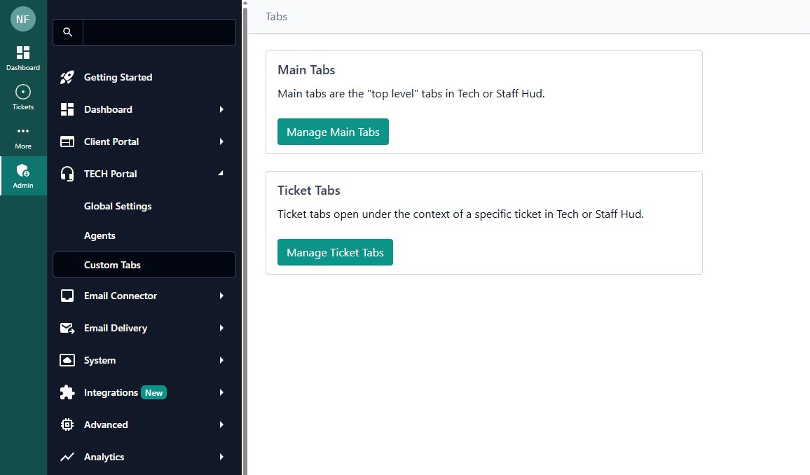 Configuration for this can be accessed from your Admin Portal under TECH Portal > Custom Tabs . You will be greeted by two options in the page - main tabs and ticket tabs.