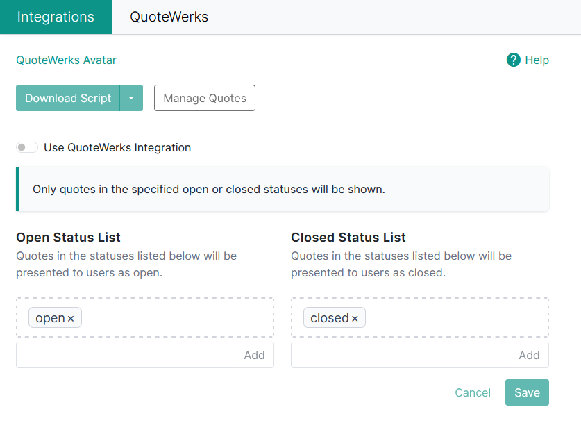 Integrations>QuoteWerks, then select Use QuoteWerks integration to enable it.