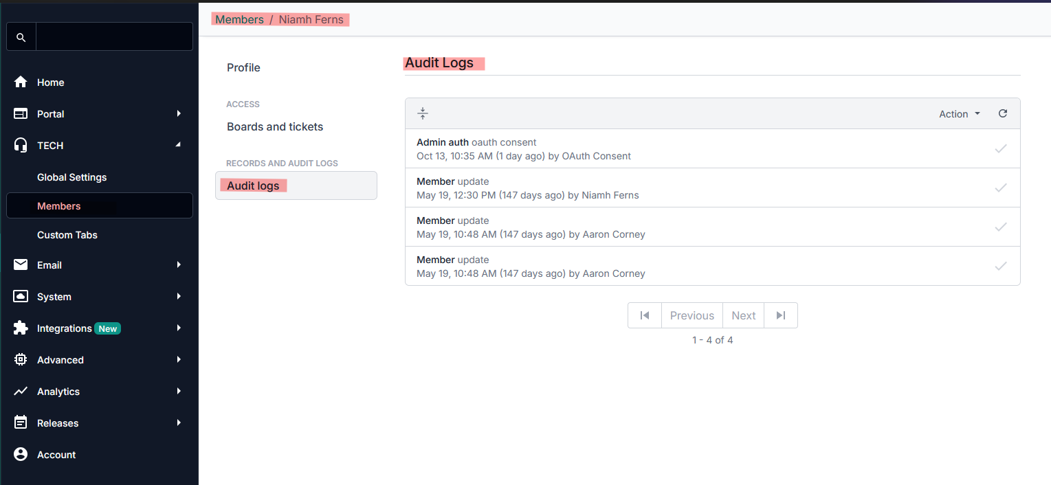 Whenever Permissions, Board access, Menus, Service Types, Service Groups User Groups, and others are changed for a Companies, Service Agents, etc, these are recorded in an Audit Log for the thing that was changed. Above, you can see an example for Service Agents*. Below you'll see what they look like expanded.