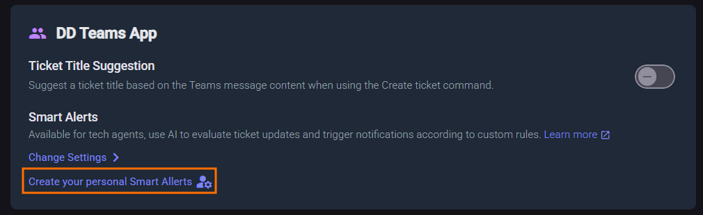 Smart Alerts is an AI-enabled feature that, based on rules defined by users using natural language, immediately notifies them on Microsoft Teams when a new ticket is created or a new message is added to an existing one.