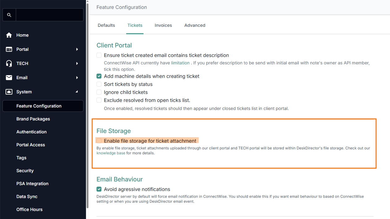 DeskDirector's file storage can be accessed in the Admin Portal under System > Feature Configuration > Tickets. It is opt-in (disabled by default). Please note that this feature is only togglable if you are using Autotask or ConnectWise as your primary PSA.