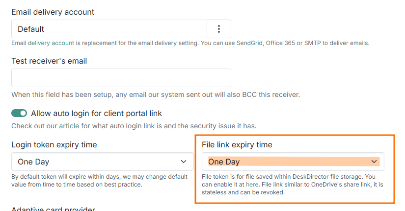 You can also configure the expiry time for files available through email download links under Email Delivery > Settings:
