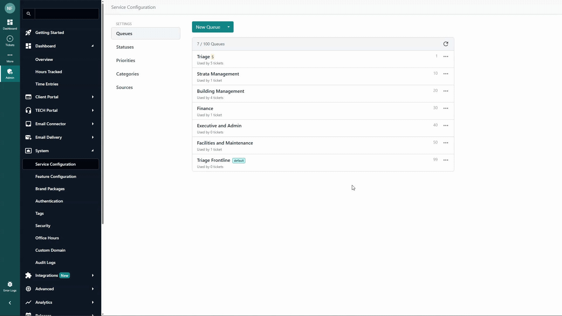 - Queues: These are analogous to boards and queues in other PSAs. They provide a centralised place for tickets to be viewed related to a specific area (e.g: development, triage, finance, etc).