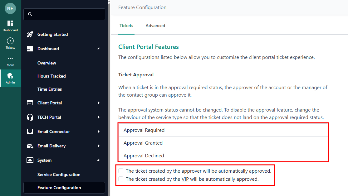Under the Ticket Approval section, you can configure the Ticket Approvals. Specifically, this is where you can view your approval statuses for tickets that are pending, approved, or declined. You can also configure automatical approvals for users that have either approval or VIP permissions granted.