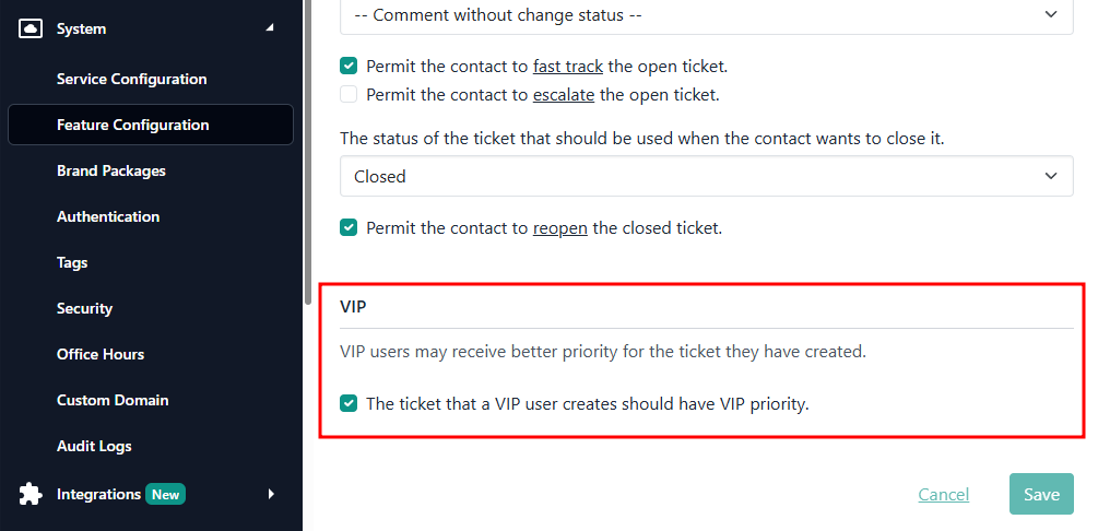 The VIP section allows you to enable or disable the VIP system globally. When enabling VIP, tickets that are submitted by a user marked as a VIP will automatically have the VIP priority regardless of what your Service Type is set to use as a default. This is useful for prioritizing tickets by important contacts at your clients.