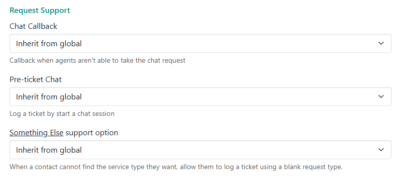 - Request Support: set what means are available to a user for requesting support (chat callbacks, pre-ticket chats, or use the "Something Else" support option).