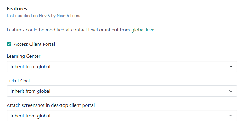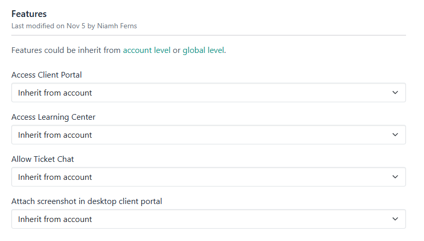 - Features: settings to toggle/set whether an account can access the Client Portal, Learning Center, Ticket Chats Feature, whether they're allowed to attach screenshots to a ticket, or use the ticket chats feature.