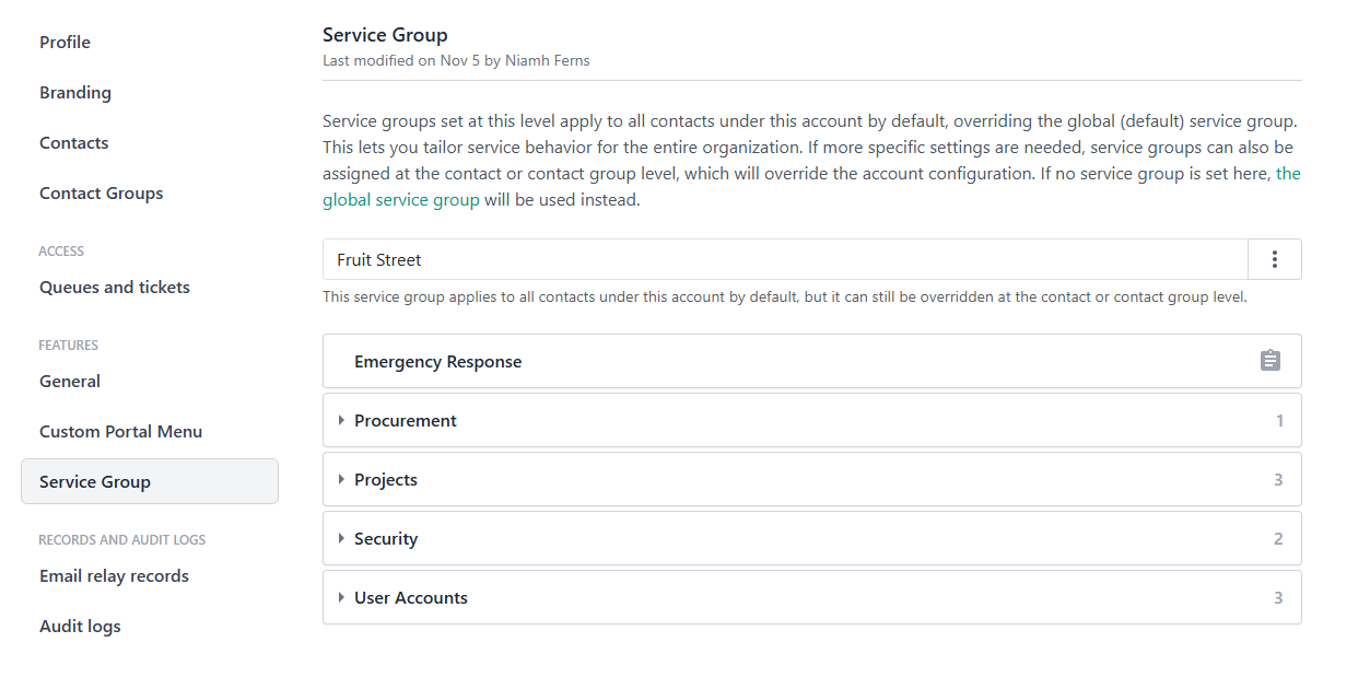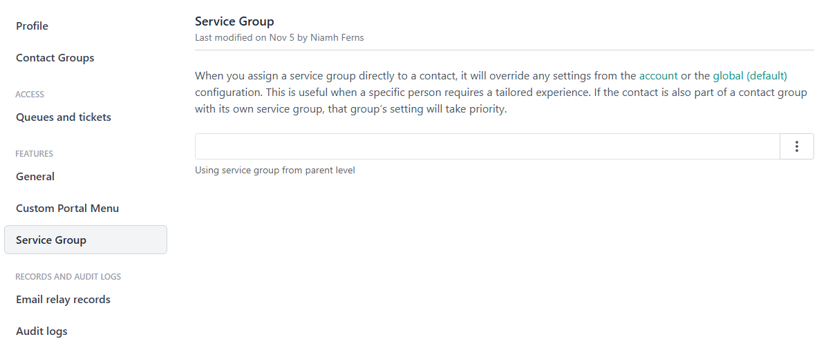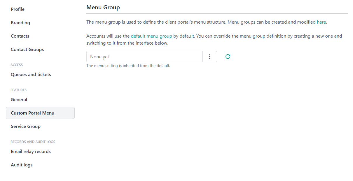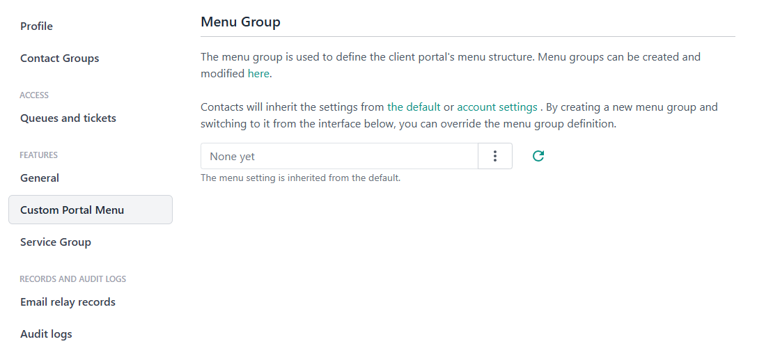 Global settings can be configured under Client Portal > Global Settings. You will have access here to configure the general features, global portal menu, and global service group for all contacts and accounts in your DeskDirector instance.