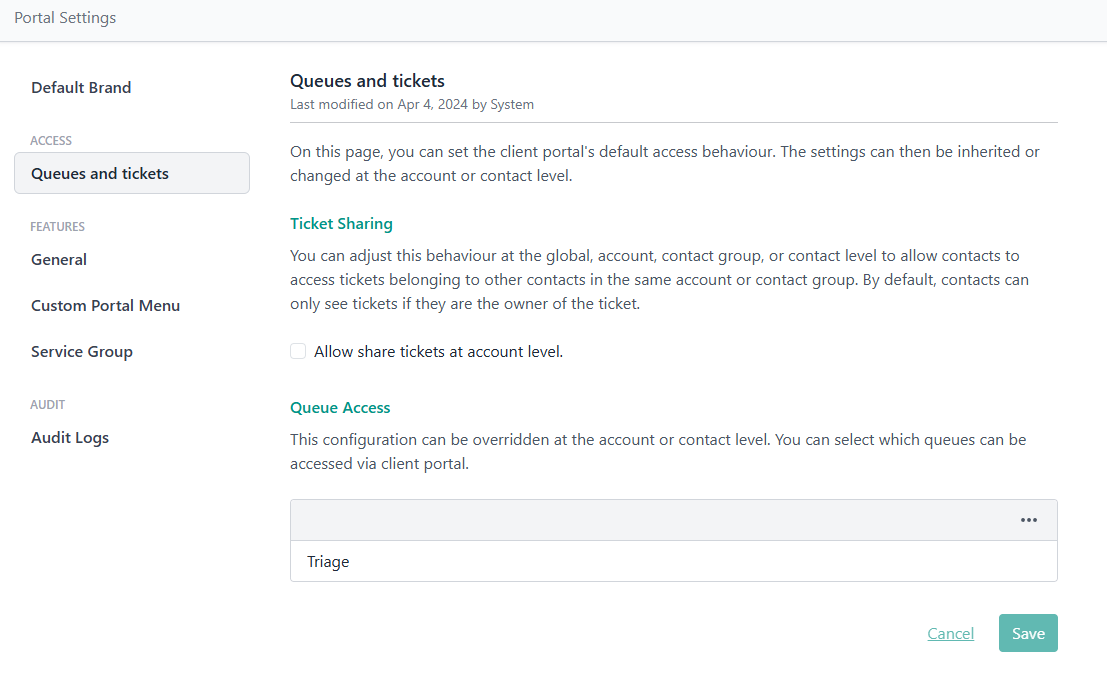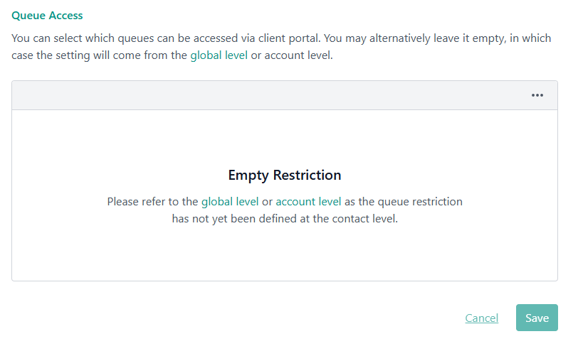 You can also set a global baseline for what Queues and tickets should be accessible to your Accounts, Contacts, and Agents: