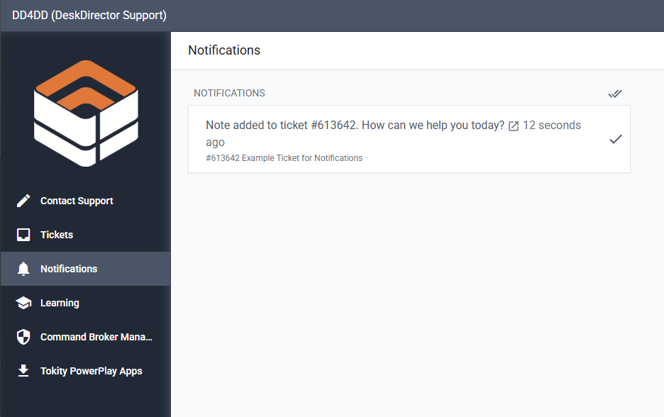 Notifications are a great way to keep track of any activity on a site Ticket Notifications make it easy to keep track of tickets that you have handled or assigned to you. All your notifications will be visible under the Notifications tabs in the DeskDirector Tech portal.