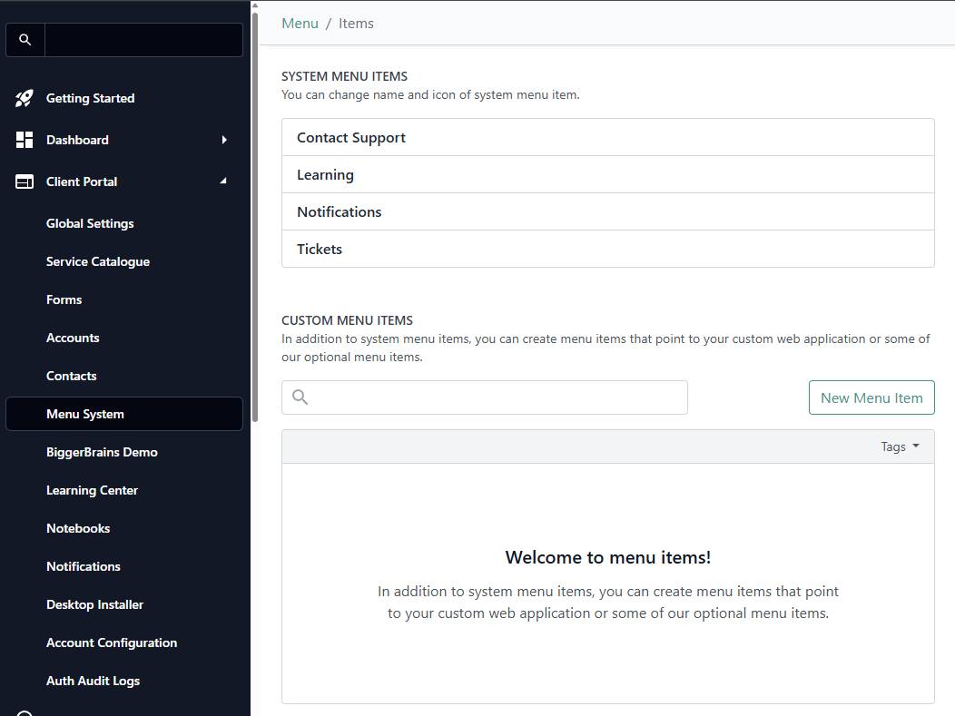 You can search, modify, create, and delete menu items from the Menu Items page inside your Admin Portal. In general, you will be able to customise the name and icon of menu items. Be aware that horizontal space inside the Portal Menu is limited. Therefore, names that are too long will be truncated with ellipses. You can also add searchable metadata to the items, known as tags. These are here to help you manage and organise your items.