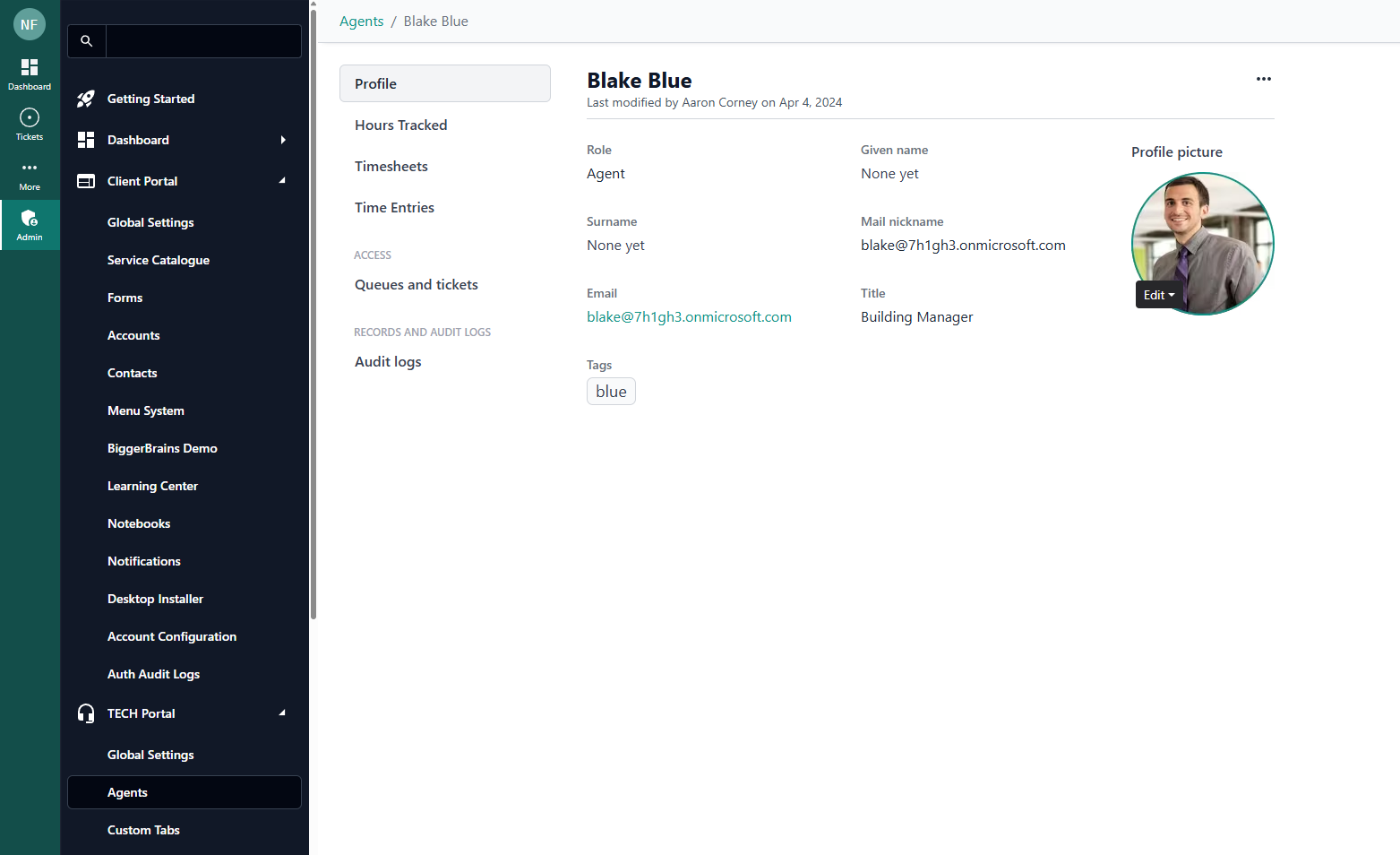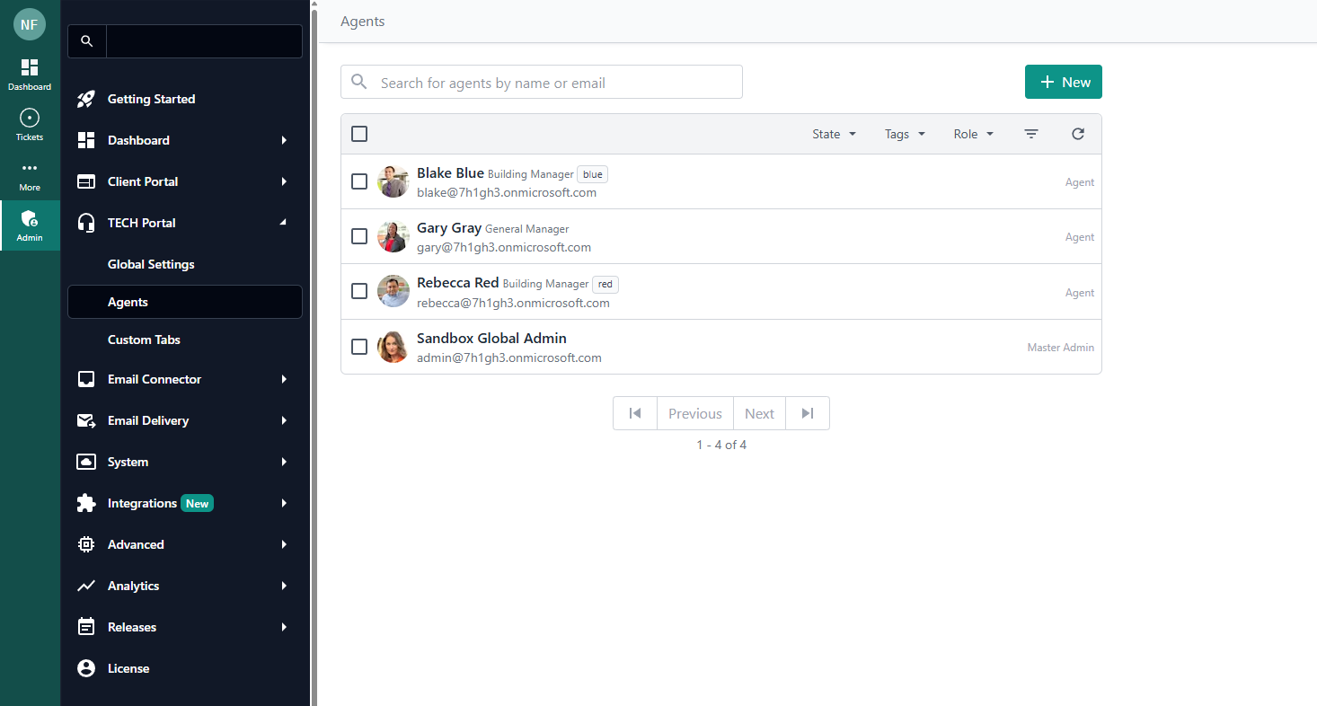 Managing Service Agents profiles in your DeskDirector instance is also straightforward. You can access this via the Admin Portal under TECH > Agents. You will be greeted by a page with the current members/resources.