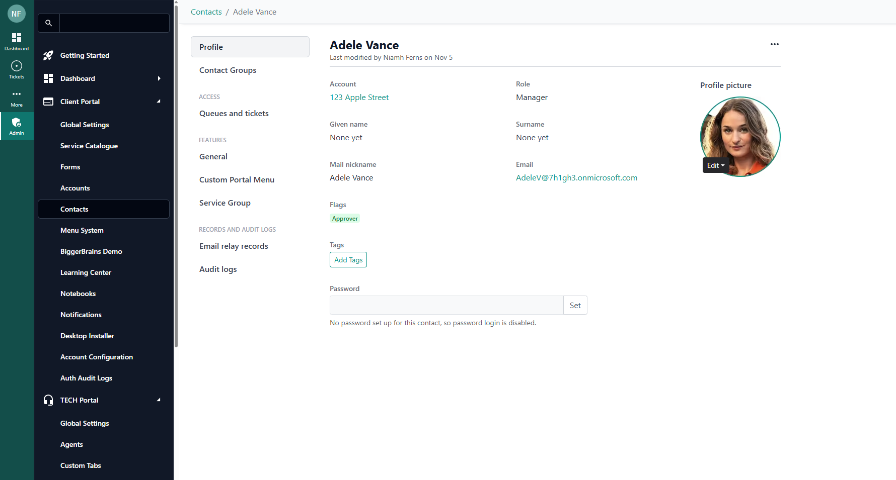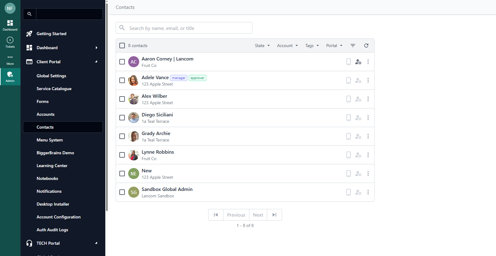 Managing Contacts' profiles in your DeskDirector instance is very straightforward. You can access this via the Admin Portal under Client Portal > Contacts. You will be greeted by a page with all your contacts.