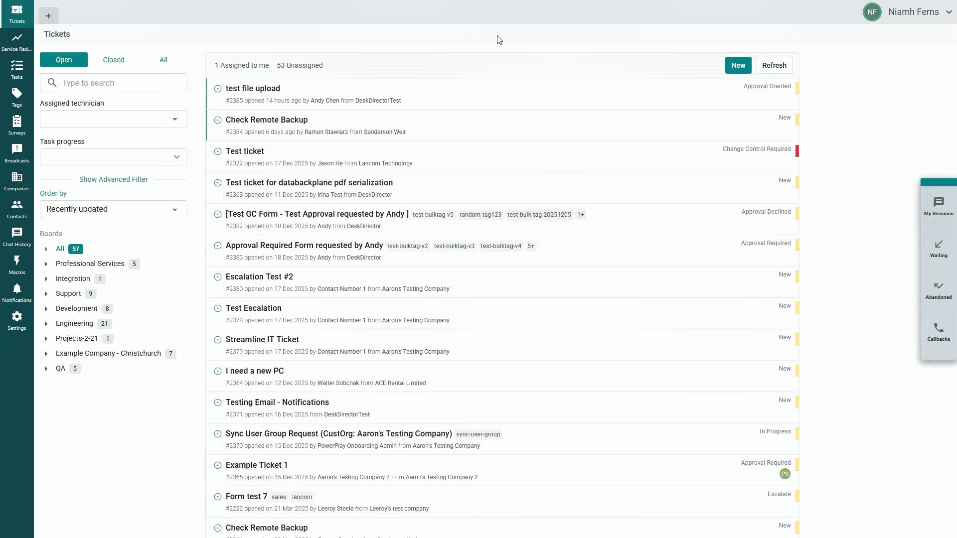 Tech members can create chat sessions for open tickets to chat with end users in real time. Chats may be opened by an agent only if the ticket has an online contact assigned.
