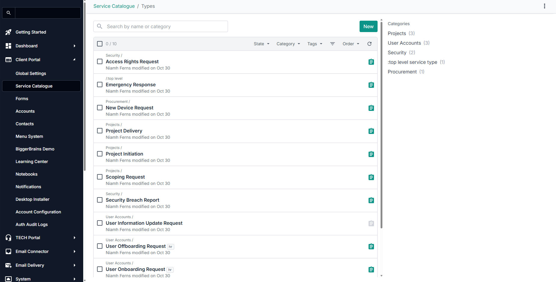 A Service Types name and category can be re-orederd to appear in a specific order in the Client portal.